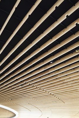 Het 238 m2 Grill houten plafondsysteem bevat veel complexiteit. De houten delen zijn van FSC gecertificeerd Amerikaans essenhout in de maatvoering 20 mm dik en 80 mm hoog. De voeg tussen de houten delen is variabel. Naast de spiraalvorm zijn ook de speciale inkepingen in het hout te zien, wat dit plafond zeer bijzonder maakt. Deze zijn bewust ontworpen voor een intrigerend lijnenspel en versterken het wervelende karakter. Bij velen doet dit sierlijke patroon denken aan een slakkenhuis.