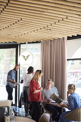 Het Derako Grill plafond is toegepast waar de buitengevel en binnenwanden als drie excentrische cirkels ten opzichte van elkaar zijn geplaatst. Bij de Exclusive-Line biedt Derako volledige engineering en projectsupport voor bijzondere plafondvormen en effecten. Bij Vardo restaurant heeft Derako veel verschillende speciale waaierpanelen uitgewerkt en geproduceerd. Vooral de overgang van de binnenste naar de middelste radius vroeg, door de niet zuivere cirkelvormen, veel engineering. Ook de aansluiting met de rechte plafondvlakken en de cirkelvormige buitengevel moest worden gerealiseerd. Voor het effect van het lijnenspel zijn alle houtinkepingen al in de productie op maat gemaakt.