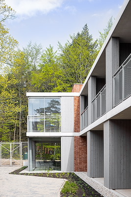 Het verspringen van de houten zitjes op de balkons van de appartementen geeft het gebouw een speels effect en zorgt voor privacy tussen de bewoners. Het natuurlijke materiaal van deze ‘blokjes’ past mooi bij de bosrijke omgeving van Beekbergen. Door de combinatie van het natuurlijke hout, de zachtrode bakstenen gevel en het beton van de balkons ontstaat een rustig geheel. Bovendien sluit het mooi aan bij de bestaande gebouwen van het bijliggende Markenhof.