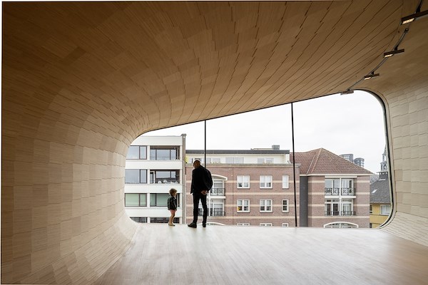 Het sculpturale kunstvenster, een van de twee nieuwe blikvangers van het museum, is aan de buitenzijde bekleed met aluminium shingles. Een volledig recyclebaar product, met een lange levensduur en lage onderhoudseisen. De vorm en de vouwen refereren aan enveloppen en daarmee aan de geschiedenis van het postkantoor. De binnenzijde is afgewerkt met bamboe, waarbij dit materiaal de organische vorm naadloos volgt. Naast dit kunstvenster vormt de nieuwe parkentree de tweede, eigentijdse ingreep. Een in de tachtiger jaren gebouwd tussenlid op een hoek heeft plaats gemaakt voor een contrasterende, uitnodigende en transparante entree en is eveneens bekleed met gevouwen aluminium ‘enveloppen’.