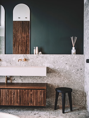 In zijn ontwerp paste de bevlogen architect en eigenaar van het in Amsterdam gevestigde bureau onder meer ‘Urban Clay’-pleisterwerk en warm notenhout toe, waardoor het sfeerbeeld warm met een rauw randje is. Iets wat ook duidelijk zicht- en voelbaar is in de stijlvolle badkamer van de bewoners. Door de bad- en slaapkamer