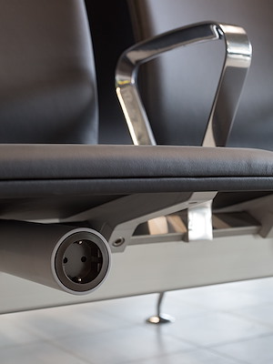 OCS ontwikkelde een passend model stopcontact, geïntegreerd in een slank buisprofiel dat onder de zitting is geplaatst. Het aluminium profiel van het meubel is tegelijkertijd een perfecte kabelgoot waardoor de halogeenvrije bekabeling loopt. Dit alles is onttrokken aan het oog van de reiziger zodat vandalisme of onveilige situaties zijn uitgesloten.