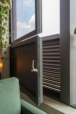 Een grote uitdaging was het formaat van de kozijnen. Het is een bloemkozijn dat vanaf de buitenkant op de gevel is bevestigd. Hierdoor ontstaat er een dieptewerking. VMX Architects licht deze keuze toe: “Aan de binnenkant win je ruimte. Je kunt er zelfs in zitten. Het formaat van het kozijn is geïnspireerd op de Nachtwacht van Rembrandt. Het is 3,5 bij 4,5 meter. Reynaers Aluminium was de enige partij die dit formaat binnen het budget kon leveren. Dit is niet alleen beeldbepalend. Het heeft ook invloed op de wijze waarop de bewoners hun woning ingericht hebben. De traditionele indeling is overboord gegooid. Bewoners bouwen hun zithoek zo op dat ze altijd naar buiten kunnen kijken.”Thermo Konstrukties en TGM waren verantwoordelijk voor het plaatsen van de kozijnen.