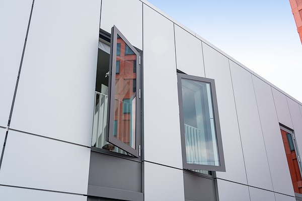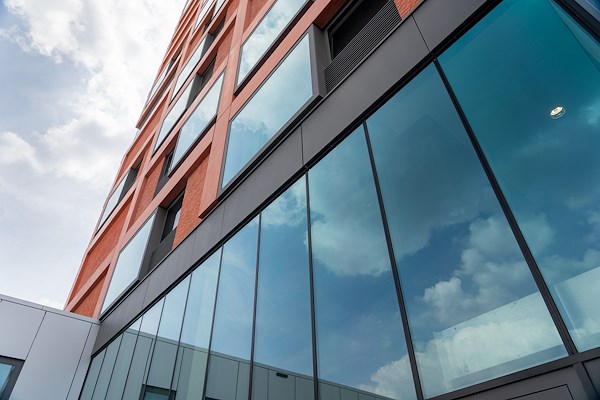 Vanuit de gemeente moest het gebouw voldoen aan de geldende geluidseisen. Hierdoor moest de raamindeling worden aangepast. VMX Architects hierover: “Het raam is nu opgebouwd uit drie delen. Een groot raam met daarnaast een filter dat het geluid absorbeert. Boven dit filter zit nog een kleiner raam dat open kan. Dit raam hebben we donker gemaakt zodat alle aandacht naar het grote raam gaat. Die beleving van zo’n groot kozijn vonden wij erg belangrijk. Je ervaart de natuur en de omgeving op die manier optimaal. De invloed van daglicht heeft een positief effect op je gemoedstoestand en leefruimte. Dat zijn zaken die voor mij als architect zwaar wegen. We zijn echt trots op het eindresultaat. Het gebouw is genomineerd voor meerdere prijzen. Dat is een mooie erkenning.”