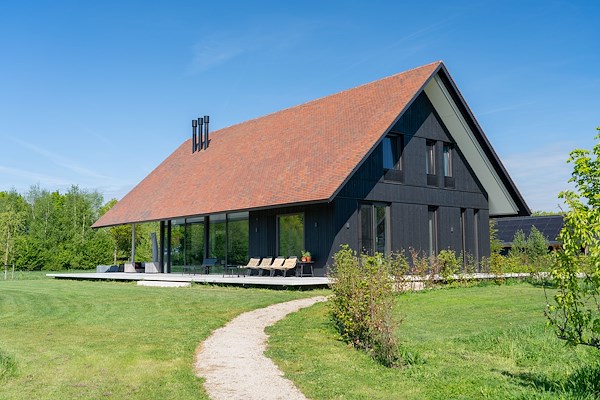 De locatie is voor HILBERINKBOSCH Architecten geen onbekend terrein. Het architectenbureau zit er praktisch om de hoek. “Dat maakt het wel extra leuk en persoonlijk,” vertelt Hilberink. “Het past niet om in deze omgeving een strakke, witte blokkendoos neer te zetten. We hebben daarom bewust gekeken naar stijl en vorm van omliggende boerderijen. Het gaat om een kavel in een nieuw landgoed van 6 hectare die oorspronkelijk vrij laag lag. Dit is opgelost door de kavel op te hogen met zand dat vrijkwam bij het uitgraven van de zwemvijver. Hierdoor is de woning 50 centimeter boven het maaiveld getild. Je kijkt niet op het landschap, maar je ervaart het vanuit dezelfde hoogte. De natuurbeleving is hierdoor nog intenser.”