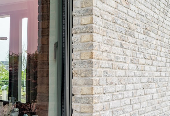 Aan de buitenzijde zijn de verzonken kozijnen opvallend. Zowel het kozijn als de zonwering is weggewerkt achter de gevel. Een bewuste keuze voor In ’t Veld. “Bij dit ontwerp hoort een soort abstractie in de materialisering. De buitenkant van het gebouw moest heel massief voelen en geborgenheid bieden. De oplossing vonden wij in het toepassen van dieptenegge waardoor de kozijnen verborgen liggen achter het metselwerk. We hebben daarom bewust gekozen voor het MasterLine 8-profiel van Reynaers Aluminium die door gevelbouwer Vromans Kozijnen werden geplaatst. Dat was echt leidend. Het draaiende deel zit verdekt in het kozijn. Bovendien kan er een hoge isolatiewaarde gehaald worden. Het kozijn is nagenoeg onzichtbaar maar toch is het beeldbepalend.” In ’t Veld is ook te spreken over de afwatering. “Het is ons gelukt om het onderdetail uit te voeren met een natuurstenen dorpel ervoor. Dat kan nog wel eens uitdagend zijn omdat je met de afwatering zit die in de spouw loopt. In dit geval hebben we met extra kleine afwateringsgaten en een niet-absorberend hard isolatiemateriaal gewerkt waardoor het toch gelukt is.”