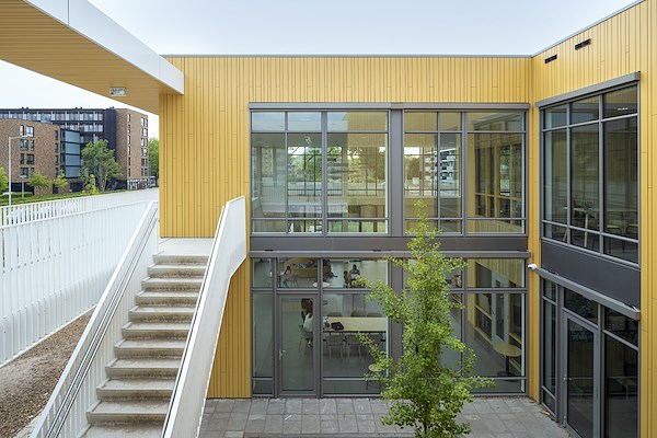 Niet alleen het interieur valt op. Braspenning: “Grote overstekken en gaanderijen zorgen ervoor dat de zon het gebouw niet hinderlijk binnenvalt zodat er een prettig klimaat ontstaat voor onderwijs. Door de hoge glazen gevels kijk je vanuit de wijk zo naar binnen en vanuit de school naar buiten. Zo maakt het gebouw gelijk verbinding met de buurt.”