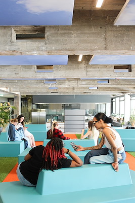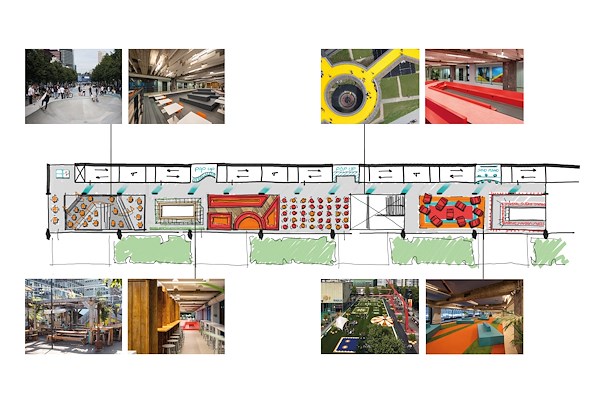 Door de bestaande hoogteverschillen in de ruimte te benutten en de bestaande betonnen structuur te gebruiken als begrenzing van de zones, ontstaan er verschillende ontmoetingsruimtes. Variërend van een ‘skatepit’ met geïntegreerde banken en tribune die ingezet kan worden voor het geven van presentaties tot de ‘Luchtsingel’ die de ruimte doorsnijd en een catwalk vormt voor modeshows van het Beauty & Fashion college.