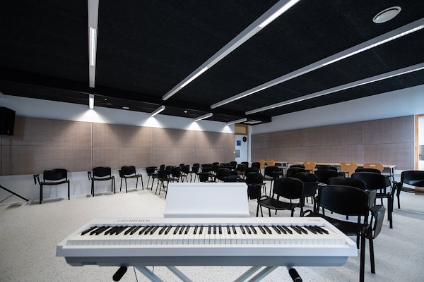 Bijzonder in dit project is de diversiteit aan kleuren die gekozen werd bij de plafonds. "Wat de kleur betreft, wilden we deze gebruiken om specifieke elementen te accentueren: de trappenhuizen , de "enkelvoudige" zalen (CDI, muziekzaalfoyer voor studenten, enz.)", legt architect Grégory Kaelin uit.
