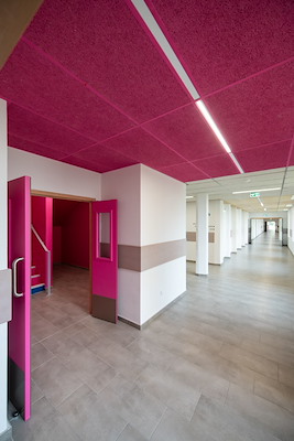 Een kleurrijk resultaat bij renovatie van de middelbare school Jacqueline Auriol! De school is gevestigd in een voormalig bedrijfspand en opende in september 2021 haar deuren.