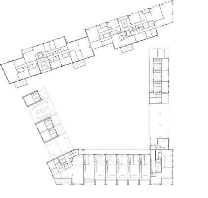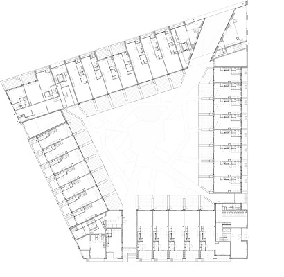 Het hoge bouwdeel is verticaal geleed als een rij pakhuizen. Constructief bestaat het uit twee volumes, net versprongen ten opzichte van elkaar voor onze doorzon-ambitie. De bouwdelen hebben ieder een eigen kern met een portiek-ontsluiting van drie of vier woningen per verdieping.