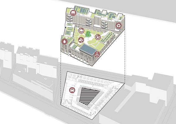 Bovenop de appartementen aan de wind-zijde staat het zogenaamde ‘powernest’, met windturbines en PV-panelen waarmee het blok wordt voorzien van energie.