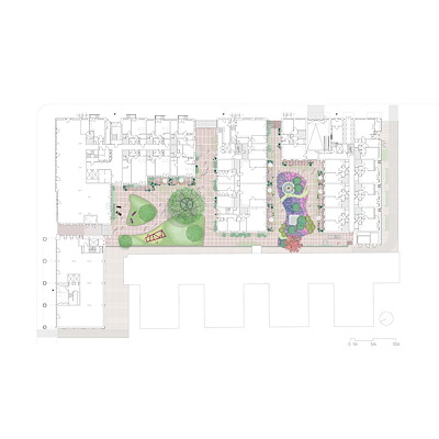 De groene binnentuinen verbinden de bewoners van de 4 verschillende bouwblokken met elkaar. Het groen wordt doorgezet op de lagere dakdelen, waarbij blok ‘Frederik’ over een collectief dakterras beschikt. Op de bovenste daken zijn zonnepanelen geplaats, die samen met een collectief WKO-systeem zorgen voor een duurzaam energieconcept