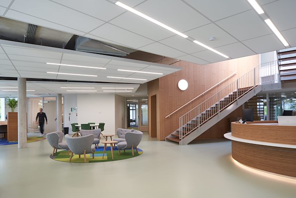 Raadzaal, publieksbalie, werkplekken en sporthal met elkaar verbonden