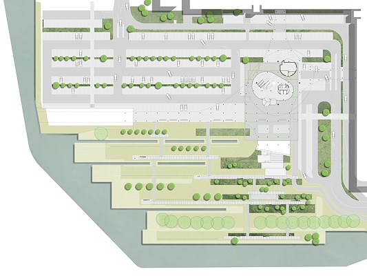 Het ontwerp voor het entreegebied bestaat uit 4 elementen: de herinrichting van het maaiveld op laag 01, een dek voor voetgangers op laag 00, een compact entreepaviljoen en een opvallend dak.