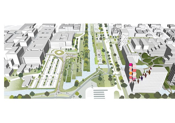 Het ontwerp opent het gesloten, institutionele gebouw naar zijn omgeving door een park, entreepaviljoen en groen voetgangersdek toe te voegen waar eerst alleen parkeren was. Door het verwijderen van de rondweg en het uitdunnen van het groen worden monoliet, het groen en de omliggende stad één ruimtelijk en landschappelijk continuüm, één integraal stadspark. Het ziekenhuis krijgt zo een representatief gezicht waarbij de ziekenhuisfaciliteiten – binnen en buiten - toegankelijk worden voor de buurt.