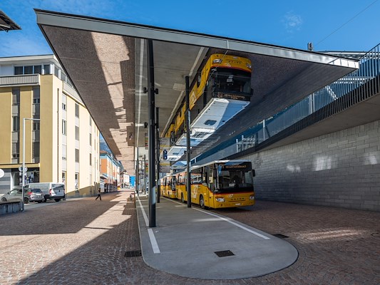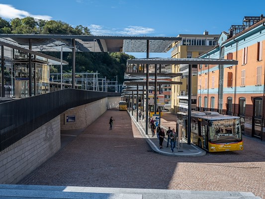 Europeans have been flocking to the Riviera, Rome, Genoa, Cinque Terre or Lake Maggiore for almost 150 years. Crossing Switzerland by rail or by road over mountain passes such as the San Bernardino or through tunnels like the Saint Gotthard, is an integral part of this mythical journey. Once the highest peaks are left behind, you reach Ticino or, to be more precise, you almost always land in Bellinzona. This is because the roads leading south converge here, it also where the south begins. But despite all the romance of travel, logistics and transport sectors now require safer, more reliable and faster routes and transport hubs. So, when the Gotthard Tunnel was modernised and opened up to high-speed trains, Bellinzona railway station was also due an update and refurbishment. The city took this opportunity to rebuild its bus station at the same time in order to provide better connections between the city centre, the station and the surrounding region. Only links following a north-south axis seem possible in Bellinzona, both in historical and geographical terms. Located on the slopes of the densely populated old town centre, the bus station is squeezed onto a very narrow plot of land at the foot of the approximately four-metre-high railway embankment. Not exactly ideal conditions for an inviting transit area which conveys an impression of safety. However, local architects Orsi & Associati came up with a solution. Their design comprises very tall, slender steel columns supporting a subdivided roof, arranged in step-like terraces and clad in ALUCOBOND® naturAL Pure and Reflect tray panels on its underside. Both zones are sheltered by the structure: the lower section covers the bus platforms; the upper one the railway platforms. The covered space looks really airy and spacious because of the tiered roof’s soaring height, and the effect is intensified by reflective ALUCOBOND® on the interior surfaces. Despite the roof’s substantial span and height, it still looks delicate, reflecting light, movement and, in some cases, historic buildings in its vicinity. The former no-man’s land beside the railway embankment has been revitalized to become a welcoming environment. The staggered height of the roof is not only in order to provide light and offer protection from the elements; it acts as a subtle guide towards the station entrance and forecourt. The old station retains its historic façade, and yet the additional elements, such as seating areas, stairways and the terraced roof structure, make it clear that this old station is now ready for the transit of tomorrow.