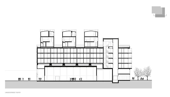 Een deel van de starterswoningen zijn 3,6 m brede doorzon-studio’s boven de eventruimte met aan weerzijden een loggia en een leefgalerij. Het andere deel zijn eenzijdig georiënteerde woningen die aan de restaurantkant vijf meter over het oude pakhuis kragen met fraai uitzicht over de haven en het nieuwe mos-sedum dak op de oude wijnterminal.