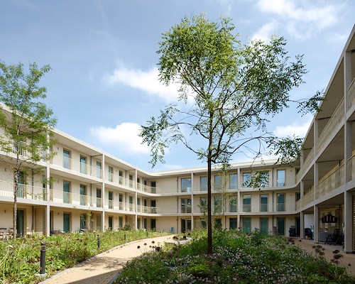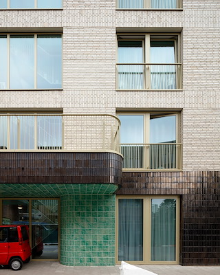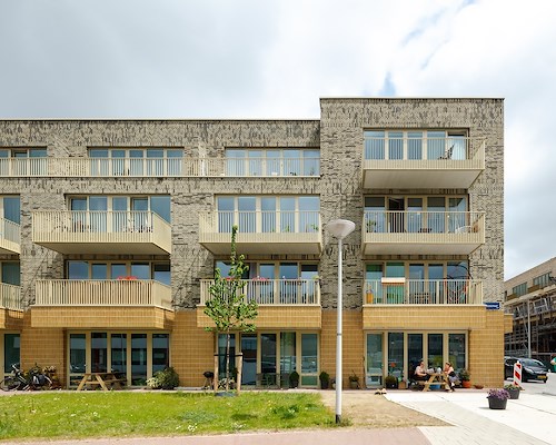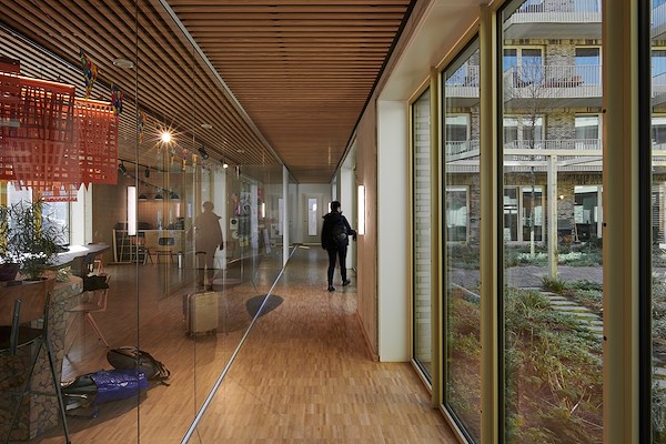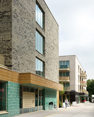De interieurs zijn ontworpen door Overtreders W. De gemeenschappelijke ruimtes worden nog niet volledig gebruikt door de Corona situatie, maar in de keuken van het hoekblok wordt al een paar keer per week gekookt. Bewoners kunnen zich hiervoor aanmelden en tegen een schappelijke prijs een maaltijd ophalen. Een deel van de bewoners maakt gebruik van zorg. Zij wonen zelfstandig doordat de Stichting Philadelphia Zorg passend bij de bewoner, ondersteuning biedt. De woongebouwen hebben een bijzonder kleur en materiaal palet met baksteen in twee kleuren en geglazuurde stenen voor de plint. De entrees zijn in samenwerking met kunstenaar Hansje van Halem vormgegeven. Hansje heeft de tegels van Tichelaar speciaal voor dit project ontworpen. De entrees liggen aan de zogenaamde speelstraat, een brede autovrije zone met een inrichting voor spelen en verblijven. De entrees zijn belangrijke plekken tussen deze openbare ruimte en het leven in het gebouw.