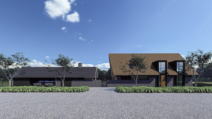 Onlangs hebben wij het ontwerp mogen maken voor een landelijke moderne #schuurwoning op een prachtige locatie in Elst (Gld). De woning kenmerkt zich door een gerende rieten kap die aan de achterzijde gedragen wordt door een groot houten spantwerk. Achter dit houten #spantwerk is een geheel open achtergevel ontworpen die een weids uitzicht biedt op het omliggende natuurlijke landschap. De voorkant kent meer privacy, maar wordt gelijktijdig gesierd door twee strakke antracieten #kaders met grote verticale kozijnen. Eén van deze kaders markeert de entrée en zorgt voor een mooie ruime #vide in de hal. Het tweede kader biedt daglicht en ruimte aan de achterliggende kamers. Beide kaders samen zorgen voor een speels gevelbeeld.
