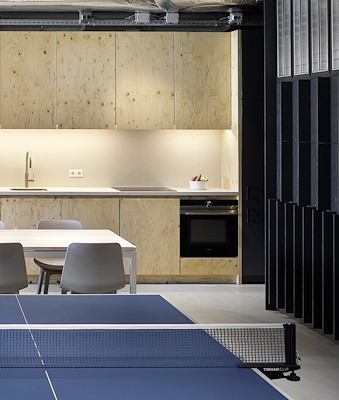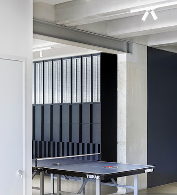 Ook de kastsystemen zijn ontworpen met modulaire onderdelen, die volledig demontabel zijn. De zwarte boutverbindingen zijn door het hele kantoor een herkenbaar element. De wanden zijn onbehandeld gehouden en laten het oorspronkelijke productieproces zien.