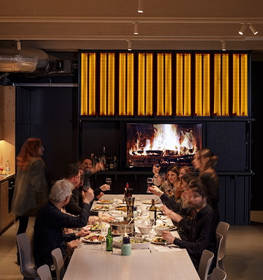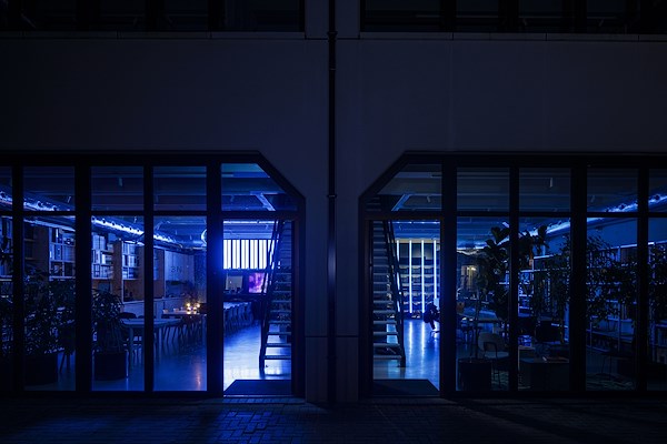 De begane grond biedt ruimte aan de materialenbibliotheek, keuken, speelruimte en samenwerkplek. In deze dynamische omgeving werkt Hollandse Nieuwe met zijn opdrachtgevers en kennispartners aan ontwerpen, maar is er ook ruimte voor etentjes, feestjes en een spelletje tafelvoetbal of tafeltennis.