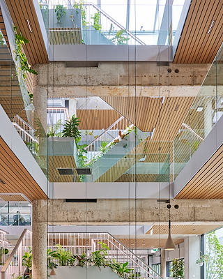 Over de volledige hoogte van het atrium loopt de centrale trap, de groene long van het gebouw en een eyecatcher vanaf de straat. De trap wordt getypeerd door split-level plateaus, die fungeren als sluiproutes en nieuwe plekken voor spontane interacties tussen collega’s. Vanwege de dynamiek op de trap zijn de collectieve werkfuncties eromheen gegroepeerd en zijn de activiteiten die meer rust of concentratie vereisen juist op afstand geplaatst.
