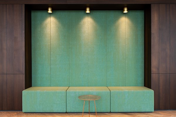 We hebben gekeken welke meubels en materialen geïntegreerd konden worden, met oog op de grondstoffen, duurzaamheid en productie ervan. Een selectie items zoals armaturen en meubels zoals klassieke Eames stoelen van het oude kantoor ging mee voor hergebruik. Beplanting keert steeds terug voor rust, schone lucht en minder stress, zoals de opvallende groene wand bij de entree, maar ook planten in de bibliotheek en tussen werkruimten. Van de kleine Boardroom hebben we zelfs een ‘tuinkamer’ gemaakt.