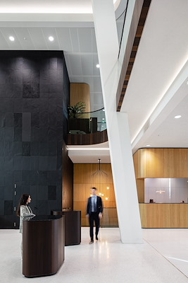Powerhouse Company organiseerde workshops met de gebruikers om precies in kaart te brengen wat ze nodig hadden, en hoe ze de ruimtes gingen gebruiken. Zo is er een perfecte balans tussen open en gesloten werkruimtes gerealiseerd. Vanwege de vertrouwelijke aard van werkzaamheden bevinden veel van de 750 werkplekken zich in afgesloten ruimtes. Er is gezorgd voor voldoende gelegenheid tot interactie, met afwisseling tussen werk- en break out ruimten. We hebben de vraag om een laagdrempelig en toegankelijk kantoor op verschillende manieren vertaald naar het interieur. Om een centrale ontmoetingsruimte te creëren die het tegenwicht vormt voor de gesloten ruimtes, hebben we het atrium aangepast. Hiermee ontstaat een laag tussen gebouw en interieur. De royale trap in de open lobby leidt omhoog naar het lichte atrium. Uit het zicht bevindt zich een tweede, meer besloten atrium; een bibliotheek-achtige omgeving voor de medewerkers.