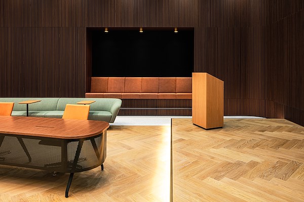 Met het interieur hebben we verschillende behoeften gecombineerd: sfeervolle openbare ruimtes voor cliënten, ruimtes voor bijeenkomsten, gezelligheid en privé-werkplekken voor juridisch werk. De toegepaste kleuren zijn verbonden aan de functies, waarbij onderscheid is gemaakt in ontvangen, ontmoeten, focus en gastvrijheid. Ondanks de grote schaal van het project hebben we overal in het gebouw de menselijke maat behouden.