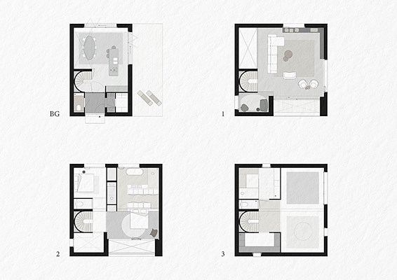 De footprint is beperkt tot een oppervlakte van 6 bij 9 meter. Daarboven mocht het volume zich weer verbreden tot een vierkant van 9 bij 9 meter. In plattegrond gevel en doorsnede spelen deze maten en verhoudingen steeds weer een rol in de opdeling van de verschillende ruimtes. De begane grond is met een grote vide verbonden met de eerste verdieping, en die verdieping door de loggia met de tweede verdieping. De derde verdieping door een grote lichtkoepel met de lucht en kijkt weer terug naar de polvertoren. Door het volume heen cirkelt een betonnen spiraaltrap met een open midden als verbindende verticale kern door het hele huis. De plint werd voorzien van een gladde geschilderde stuc, de bovenzijde van een grove ‘kratzputz’ om de zwaarte-omkering nog iets sterker aan te zetten. Het huis heeft een dikke warme schil, is compact en heeft een volledig geïntegreerd zonnedak die de warmtepomp van energie voorziet.