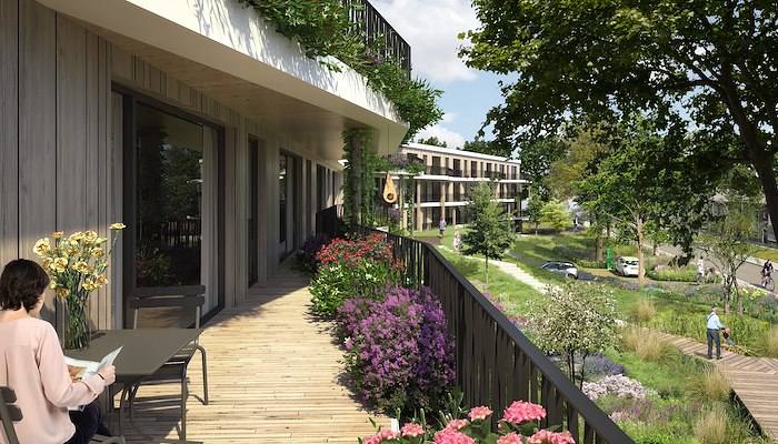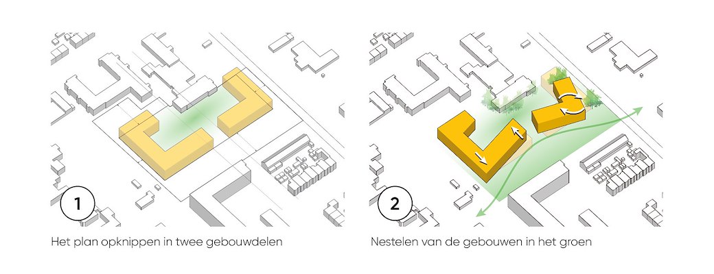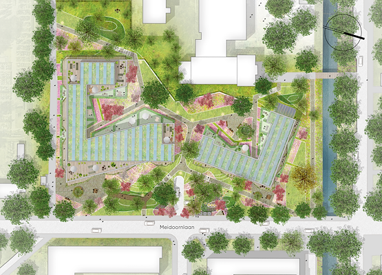 De verschillende groene plekken lopen geleidelijk in elkaar over. Het ruimtelijke en open karakter geeft gebruikers het gevoel dat deze in gebruik kan worden genomen voor verblijven, spelen en ontmoeten. privé naar openbaar worden zorgvuldig vormgegeven. De gebouwen zijn met de voordeuren, gemeenschappelijke ruimtes en buitenruimtes op de openbare ruimte gericht en daarmee verbonden. Bij de balkons en bredere galerijen is een fraaie overgang ontworpen met een subtiel vormgegeven hekwerk en geïntegreerde plantenbakken. De beplanting in deze bakken zorgt voor een groene uitstraling van het gebouw en voor voldoende privacy op de balkons.