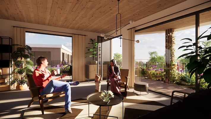 Sociale duurzaamheid is één van de belangrijke uitdagingen van de toekomst. Om die reden vormt dit een integraal onderdeel van onze ontwerpvisie. Als ruimtelijk middel ontwerpen we een levendige plint met flexibiliteit. Hier kunnen verschillende voorzieningen worden opgenomen die in de tijd kunnen veranderen. Huiskamers gelden als ontmoetingsruimte en bevinden zich aan beide uiteinden van de groene as en bevorderen hiermee de sociale interactie aan de parkruimte. De indeling wordt gedurende co-creatie met de toekomstige bewoners en corporatie bepaald. Denk hierbij aan een spelletjesruimte, yogaruimte of gedeelde keuken of in de toekomst wellicht tijdelijke pop-up voor een fysiotherapeut.