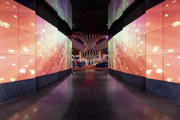 De grote glazen fiches zijn voorzien van een LED en verlichten de gevel ‘s avonds op spectaculaire wijze, waarbij de bloemvormige opbouw van het volume van het casino geaccentueerd wordt. De LED façade is volledig dynamisch en programmeerbaar, af te stellen op verschillende thema’s.