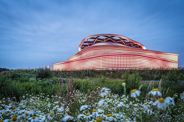 Land. Het gebouw rijst op uit het landschap, waarbij de parkeervelden de bloembladeren van de bloem vormen. De banden om de parkeervelden vloeien voort uit de vloeiende lijnen van het gebouw. Op deze manier is het gebouw onlosmakelijk met het landschap verbonden.