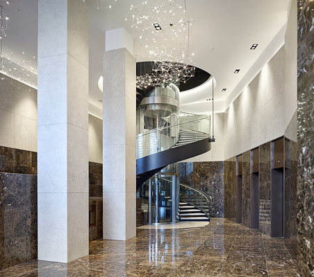 Van de oorspronkelijke architectuur was nagenoeg alleen de kolommenstructuur en het monumentale trappenhuis origineel. Om het gebouw de sfeer van weleer te laten ademen in combinatie met een moderne uitstraling, is het gevelmetselwerk en het trappenhuis gerestaureerd en is het kleuren- en materialenpallet met brons, diepbruin natuursteen en zwart staal hersteld en op een subtiele manier vertaald.