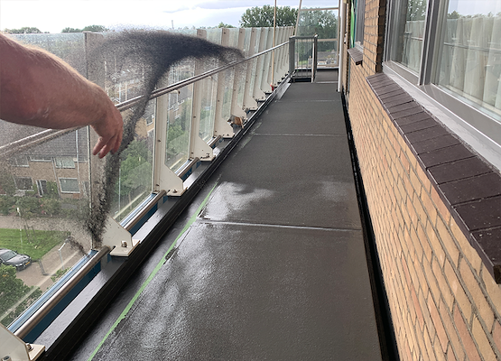 , zonder primer. Dit systeem biedt bescherming, antislip en kan in verschillende kleuren worden aangebracht. Een groot voordeel van dit systeem, is dat het kan worden aangebracht over de bestaande ondergrond. Voor een esthetische uitstraling is er gekozen voor een grijze kleur.