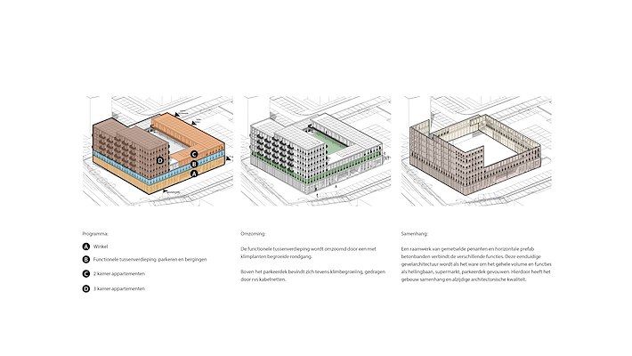 Tussen de supermarkt en het woonprogramma heeft MNNR Architects een parkeerdek voor de bewoners geplaatst. Het parkeerdek kent een ‘groene rondloop’, die wordt gerealiseerd met verschillende klimopsoorten langs de gevel. Langs deze omloop liggen ook de bergingen.