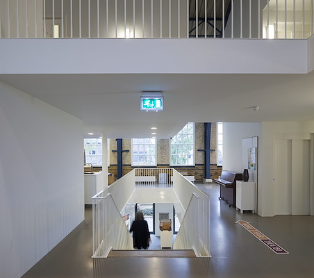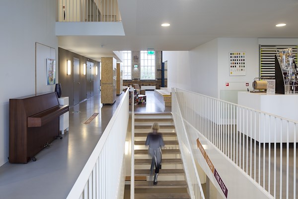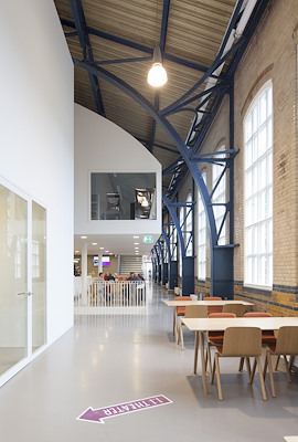De rigide betonconstructie op de begane grond en de heldere ritmiek van stalen spanten en hoge vensters op de verdieping, zijn samen met het geglazuurde schoon metselwerk beeldbepalend in het interieur. Op de verdieping is de nieuwe invulling letterlijk los gehouden van het bestaande gebouw, waardoor eisen met betrekking tot geluid en comfort haalbaar zijn.