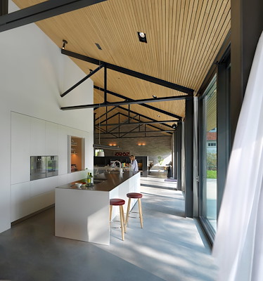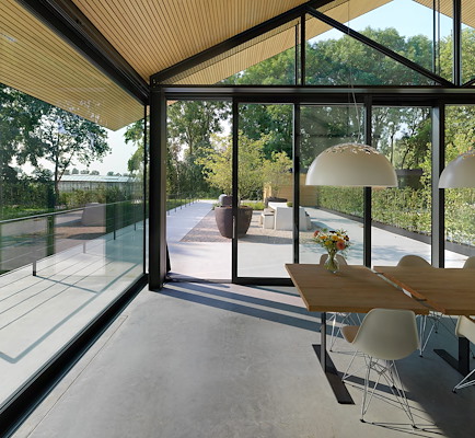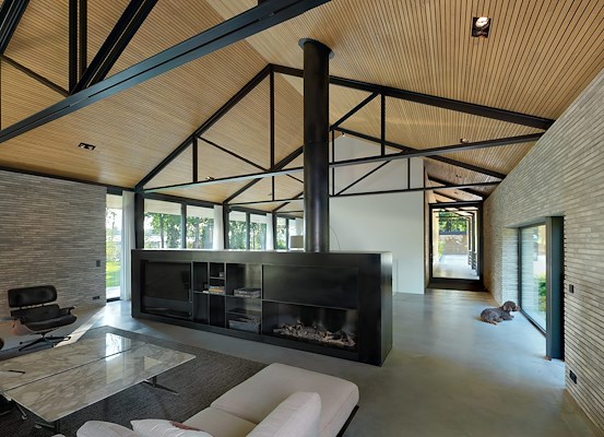 Door de enorme glaspartijen hebben de bewoners niet alleen een prachtig zicht op de tuin en de achtergelegen polder, maar valt ook het natuurlijke licht op een fraaie wijze in de woning. Het interieur van de woning kent een minimalistische, landelijke sfeer. Het materiaalgebruik van de woning is puur. Grijs metselwerk met gebeitst hout en een mat zwart zinken zadeldak. De eenduidige constructieve opzet van het huis is afleesbaar. Deze is opgebouwd uit een betonnen kelder met stalen spanten. De ritmiek van de spanten bepaalt in combinatie met het genuanceerde metselwerk en de houten betimmering van het dak de sfeer van de woning. Een monolithische betonvloer voor de gehele begane grondvloer loopt door naar buiten tot aan de carport en de overdekte buitenruimte.