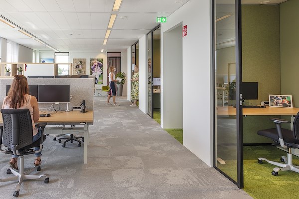 De lift komt midden in de etage boven. Naast de receptie is het ontmoetingsgebied en de zithoek het centrale punt van de etage. Daar omheen is een pantry met lunchplekken, een informeel overleggebied en een trainingsruimte gerealiseerd. Verder op de etage zijn overlegruimtes en stilte werkplekken. Deze zone werkt als buffer voor de daarachter liggende werkplekken waar ook goede balans is tussen een open vloer en ook weer stilte werkplekken.