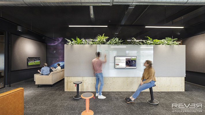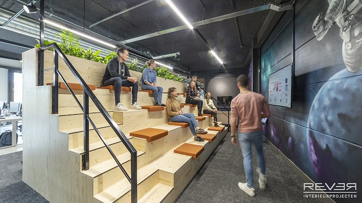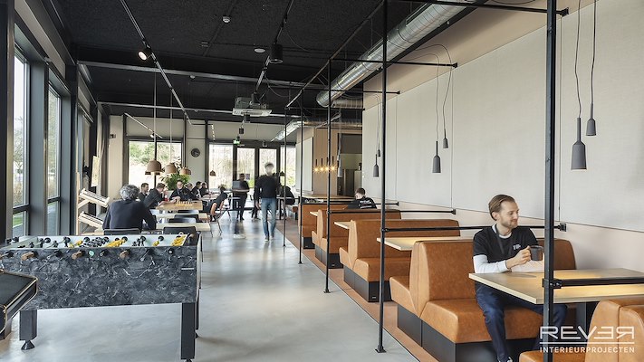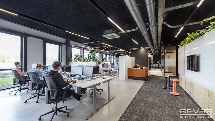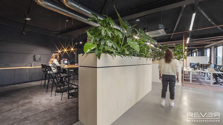 De look en feel van het concept sluit goed aan op de veelal jonge medewerkers van het bedrijf. Het interieur heeft een hippe uitstraling door het toepassen van warme nude en zachte zandtinten, veel hout en planten. Ook is er gewerkt met stoer zwart staal, akoestische grijzen panelen en betonvloeren.