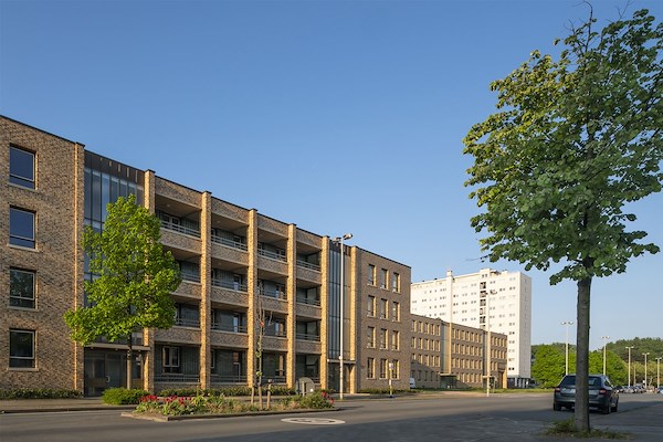 De configuratie van de langgerekte woongebouwen is min of meer vergelijkbaar met de oorspronkelijke situatie. De gebouwen zijn dichter bij elkaar geplaatst en de afmeting van de koppen en openingen is regelmatig gemaakt. De sprong in de rooilijn markeert de entree naar het bestaande binnengebied. De gebouwen zijn uitgewerkt als ensemble en opgetrokken in een genuanceerde gele baksteen. Het lange gebouw met de parkeergarage ligt terug en wordt geleed door transparante inkomhallen en trappenhuizen. Het kortere gebouw ligt direct aan de straat en heeft een korte galerij tussen twee vergelijkbare trappenhuizen. Het metselwerk van de teruggelegde galerijgevel is verbijzonderd met een groene geglazuurde steen.