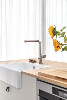 Naast de badkamer is de keuken de plek om te kunnen genieten. Er is hier gekozen voor een prachtig vormgegeven kraan van hansgrohe waardoor het meteen een eyecatcher in de keuken is. De
