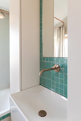 Zo zie je dat ook in een Tiny House je een luxe badkamer en keuken kan creëren met mooie producten en die ook nog eens waterbesparend zijn.