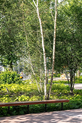 De bomen zijn grotendeels inheemse soorten, zoals moseiken, haagbeuken en lijsterbessen, en zijn in een variatie aan vormen en formaten aangeplant. De kruidlaag heeft vooral een natuurlijke uitstraling waarbij plantensoorten geselecteerd zijn op bladstructuur. Hierdoor ontstaat een rijk en divers palet uit verschillende vaste planten die voor een mooie combinatie van groen en bladstructuren zorgen.