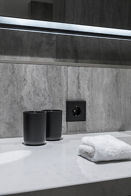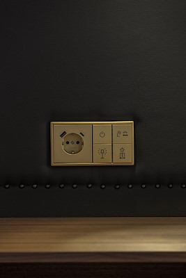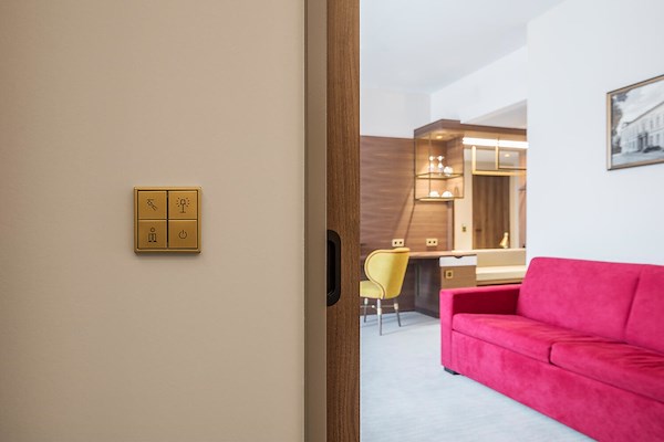 Passend bij de vraag naar maximaal comfort is de kasteelresidentie uitgerust met het intelligente KNX gebouwbeheersysteem van JUNG. De bediening van de installatie gebeurt met F 40 tasters in de LS range in Messing. Daarnaast is ook LS 990 in grafietzwart mat gebruikt. Alle kamers zijn uitgerust met een Hotelcard schakelaar zodat de stroomvoorziening grotendeels uitschakelt als de gasten de kamer verlaten. Onder de Hotelcard schakelaar zit een serieschakelaar waarmee de gasten kunnen aangeven of hun kamer moet worden schoongemaakt. Buiten naast de kamerdeur zit een hoteldisplay waarop housekeeping dit kan zien. Op dit display zit een ook beldrukker waarmee de medewerkers kunnen aanbellen. Ook hebben alle kamers een JUNG DAB+ Radio, die perfect past in de ramen van de LS range en met de glazen afdekking een luxe uitstraling geeft. De gasten kunnen nu met hun favoriete zender de dag beginnen. Voor het opladen van smartphone of andere mobiele apparaten zijn de contactdozen voorzien van USB laders, zowel type A als type C.