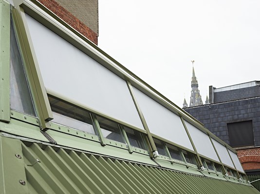Dimitri De Cuyper (zaakvoerder Pakhuis): “De dakkoepel is altijd al een issue geweest op warme dagen, zelfs vóór de verschillende hittegolven van de afgelopen zomers. Met de zon vol op het glas werd het binnen vaak te warm. Daarom werd er in 2002 al eens een binnenfolie op het glas gekleefd. Maar toen die 2 jaar terug aan vervanging toe was, besloten we op zoek te gaan naar een efficiëntere oplossing, zeker ook omdat we bij elke investering aan dit pand het ecologische aspect hoog in het vaandel dragen.”