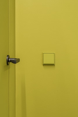 Het gedurfde vormgevingsconcept staat bol van radicaliteit. Alle details staan op de achtergrond ten gunste van het grote geheel. De vloercoating in één kleur, overschilderbare en in de wand verzonken deuren, het ontbreken van plinten en zelfs het schakelmateriaal is exact afgestemd op het kleurconcept. De tijdloze schakelaars LS 990 in Les Couleurs® Le Corbusier vert olive vif, céruléen vif, l’ocre rouge moyen en gris clair 31 passen naadloos in het ontwerp.