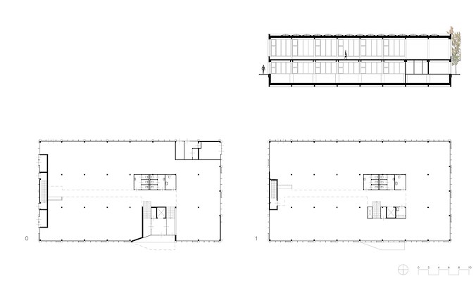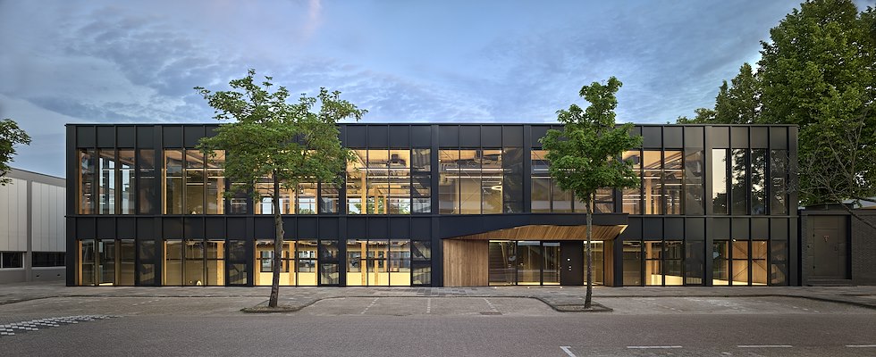 Dit rechthoekige gebouw leent zich voor een invulling met 1.280m2 aan kantoor- en/of bedrijfsfuncties. Door nieuw te bouwen boven op een bestaande betonnen souterrainvloer creëerde DAMAST architects twee extra hoge verdiepingen die vrij indeelbaar zijn. Beide verdiepingen fungeren zelfstandig en delen een uitnodigende entreepartij. “Superflexibiliteit en hoge ruimtes zijn essentieel voor een modern kantoor. Het zorgt voor een comfortabele, toekomstbestendige werkomgeving die eenvoudig aangepast kan worden bij veranderende wensen”, vertelt architect Daniël Peters.